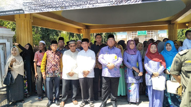 | Wabup HSU H Husairi Abdi Lc bersama Ketua TP PKK HSU Hj Anisah Rasyidah Wahid dan Wakil Ketua Hj Elianoor Husairi dan unsur Forkompinda melepas rombongan Kloter 19 Embarkasi Banjarmasin. |