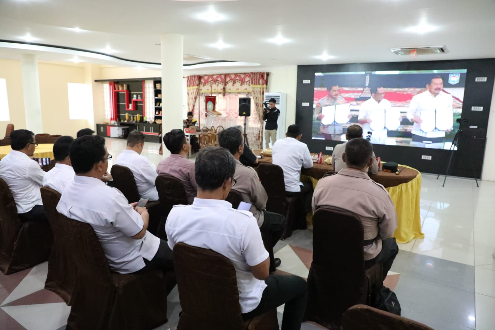 Turut hadir mengikuti vicon tersebut Kapolres HSU AKBP, Moch. Isharyadi Fitriawan S.Ik, Kajari HSU Agustiawan Umar, S.H, M.H, Plt. Asisten Bid. Pemerintah dan Kesra H. Adi Lesmana, S.Sos, M.Si, Plt. Inspektur HSU Syahriadi, S.Sos, M.Si serta jajaran instansi terkait lainnya.
